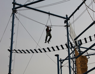 接著,進行的是“高空抓杠”,看到那空中搖晃的單杠和那高高的鋼管,每一個伙伴都大膽進行了嘗試,沒有一個人退縮,當每一個伙伴從10多米高的鋼管頂部站起來、飛身去抓單杠的時候,伙伴們都毫不吝嗇地大聲喝彩和鼓勵!斑@種感覺我會終身難忘,我想如果沒有親身體會的人是永遠不能有這種感受的!边@是伙伴下來后說得最多的一句話。 最后一個項目是畢業墻,面對4米高的無任何攀扶點的畢業墻和20分鐘的規定時間,兩個隊一下了團結在了一起。聽完教練的講解,行動就正式開始了!拔蚁壬稀以谙旅妗阆壬稀稀w重大的上…誰倒掛…我…誰最后…我…”驚心動魄的19分16秒過后,所有伙伴全部通過畢業墻。當大家站在畢業墻前分享時,許多人都不記得是誰在上面拉自己的,誰在下面推自己的,但是大家都記住了2013年3月30日這個經歷心理和生理嚴峻考驗的終身難忘的日子,記住了我們團隊中的每一個生死與共的患難伙伴,我們已經是具有堅不可摧的路翔團隊。