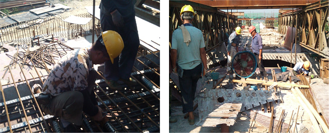 而各項(xiàng)工序的如期完工更離不開施工一線的普通路橋建設(shè)者。記得前幾天下雨,他們依然在橋上綁扎鋼筋,立模板,雨實(shí)在太大了,他們就躲在橋下休息會(huì)等雨小了點(diǎn)再繼續(xù)工作,為的就是能完成節(jié)點(diǎn)目標(biāo),從而保證最終工期。今天早上張拉豎向筋,一大早氣溫就有三十幾度了,四五個(gè)工人抬著油頂,汗順著臉頰留下來(lái),衣服都濕透了,汗水順著衣角流下來(lái)。然而工作未完成誰(shuí)都不肯休息,黝黑的臉上一笑就看到白白的牙齒。這就是我們可愛的工人,即使再苦再累他們也要把活干好,也要實(shí)現(xiàn)工期指標(biāo)。當(dāng)然項(xiàng)目部人員也沒(méi)閑著,給工人進(jìn)行高溫施工的安全培訓(xùn),合理安排作息時(shí)間,進(jìn)行錯(cuò)時(shí)作業(yè),避免高溫施工;進(jìn)行演練,并且做好防高溫后勤保障工作,備齊充足的飲用水、綠豆湯,為施工人員發(fā)放防暑降溫物品和藥品,盡量為施工人員提供良好的休息環(huán)境。